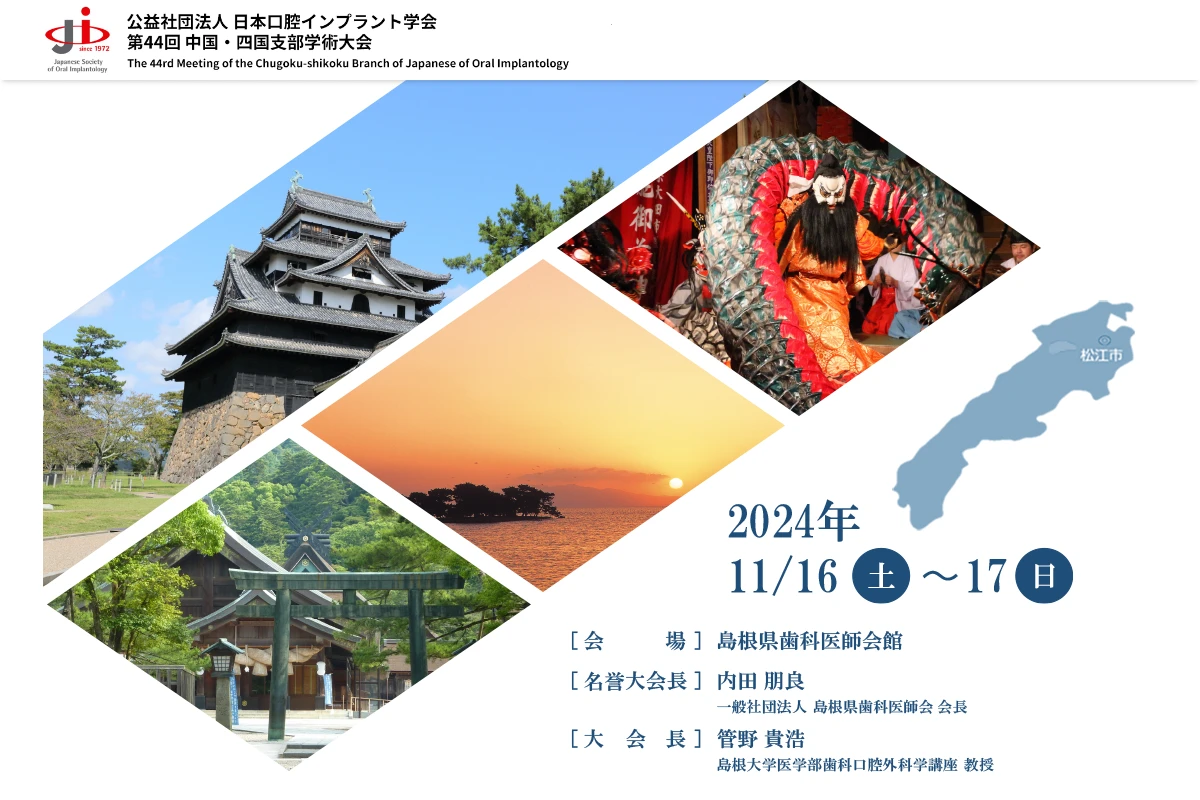 公益社団法人日本口腔インプラント学会第44回中国・四国支部学術大会は、2024年11月16日(土)~17日(日)にかけて、松江市の島根県歯科医師会館にて開催されます。島根県での開催は第30回大会(平成22年)以来、実に14年ぶりの開催となります。
