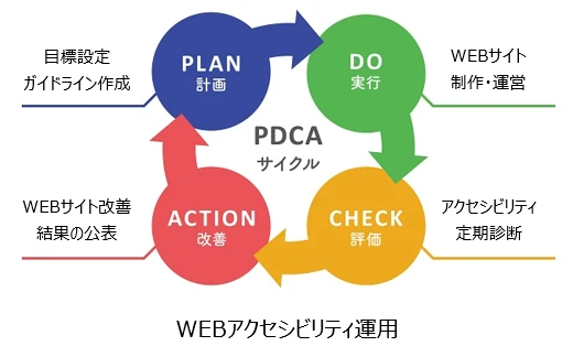 アクセシビリティのゴールを定め、サイト改善(または新規開設)、保守管理に関する人的リソース、スケジュール・予算を含めた改善計画を策定します。